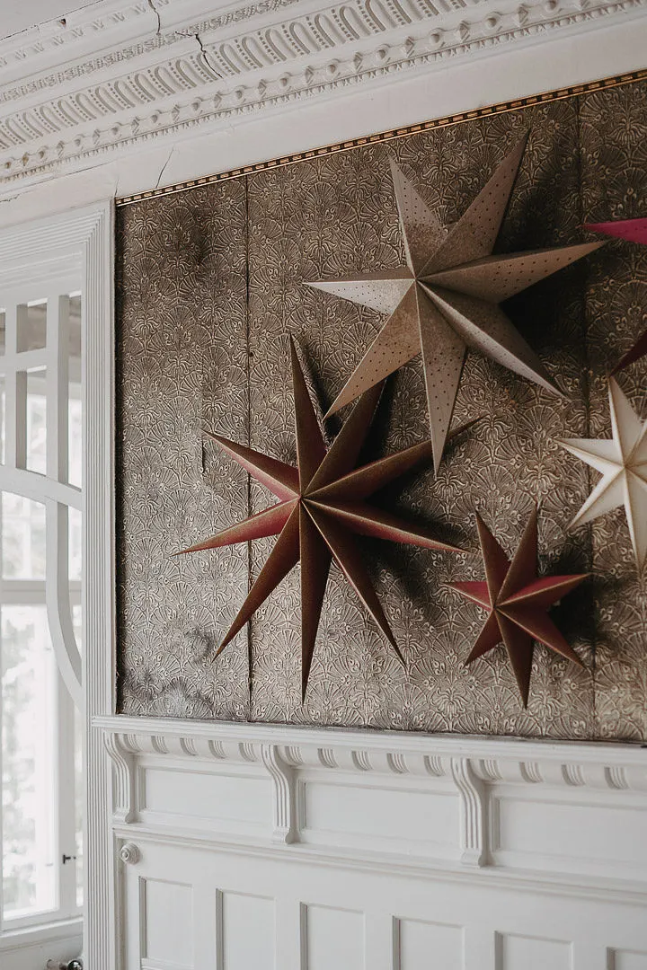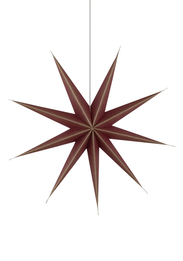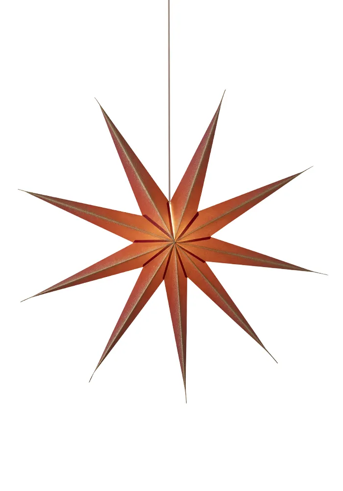 Käsintehty kauniin punainen iso paperitähti. Kaunis yksityiskohta on tähden jokaisen sakaran kärkeä koristava shamppanjanvärinen glitteri. Kaytä vain ledlampun kanssa. Kokonaisuuden viimeistelee tyylikäs läpinäkyvä johtosarja katkaisimella.