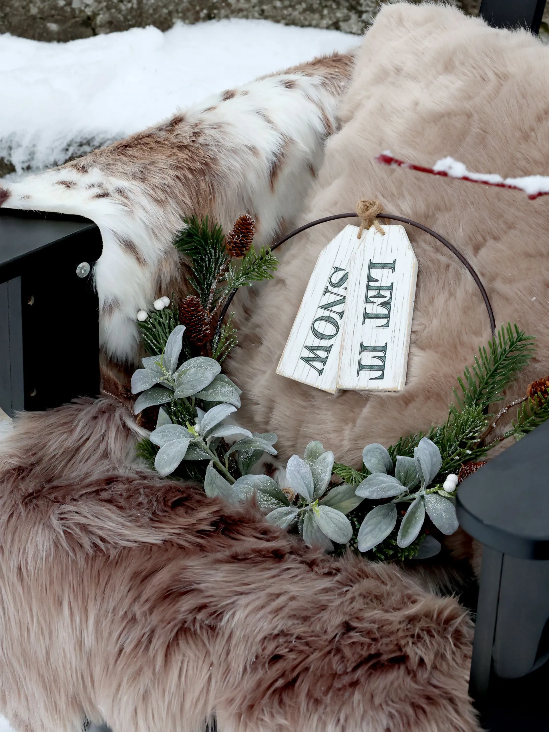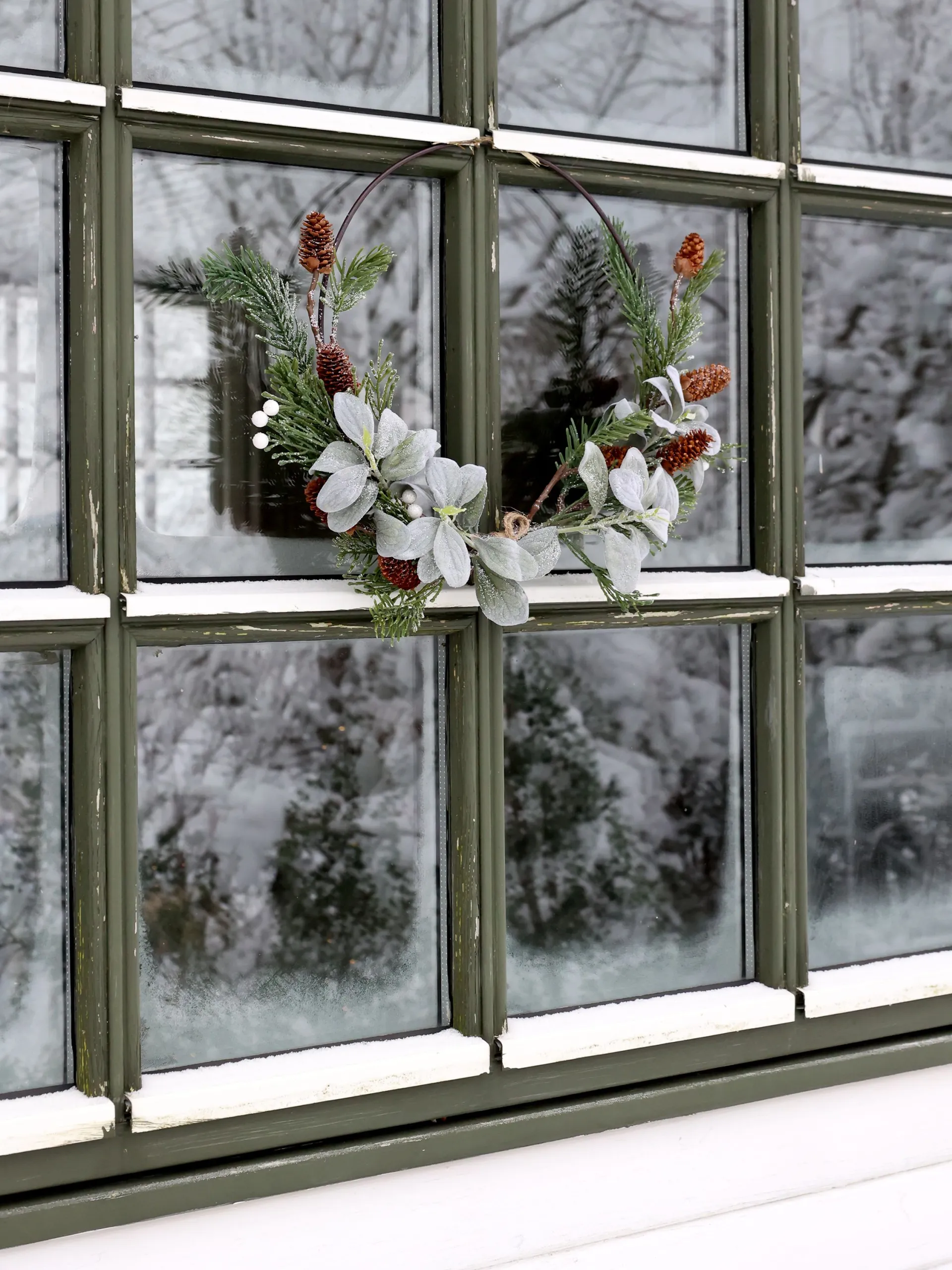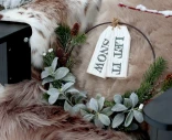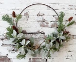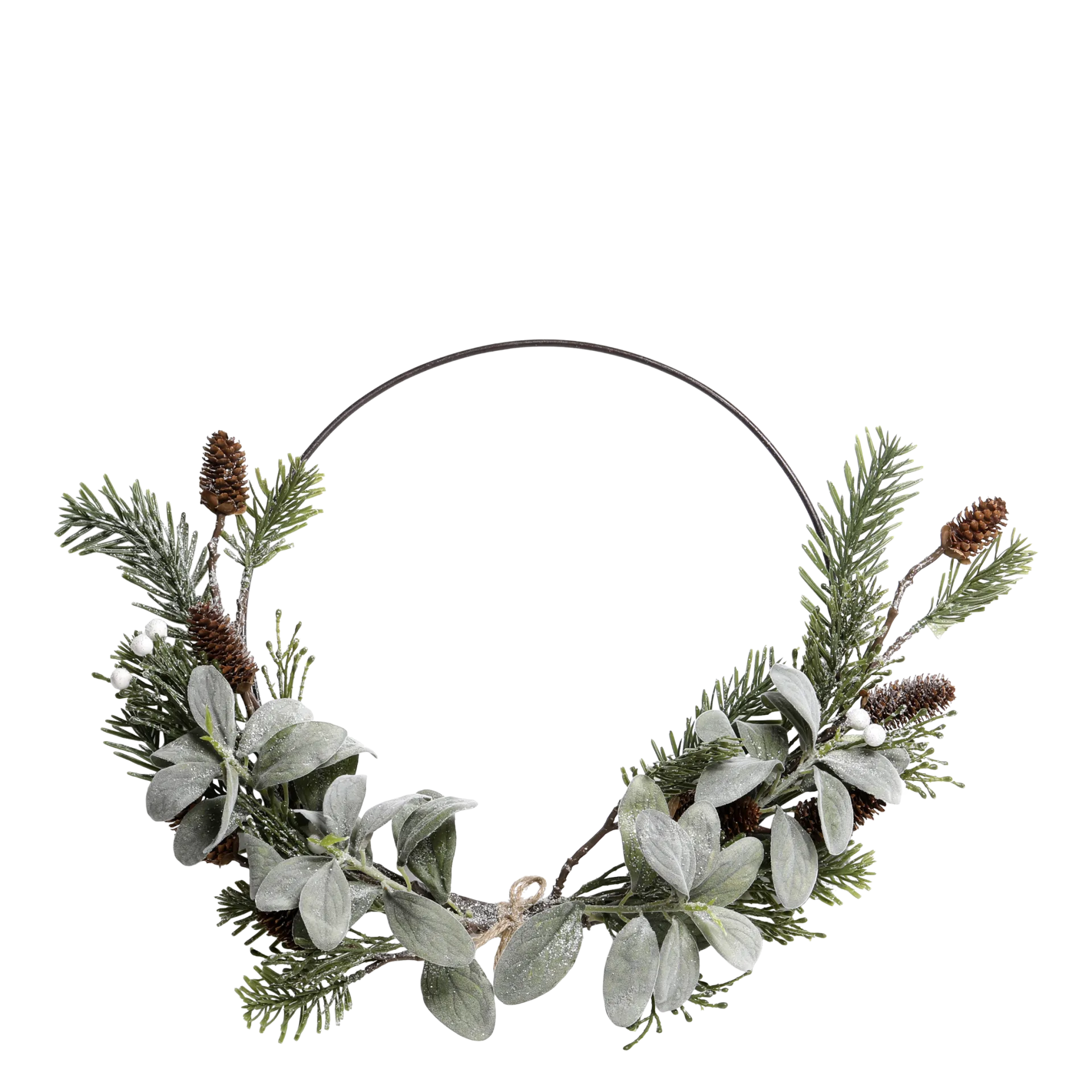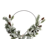 Chic Antiquen kaunis kranssi. Kranssi on tehty metallirenkaaseen. Koristeet on aseteltu renkaan alaosaan. Koristeena on käytetty käpyjä ja erilaisia oksia. Kranssin halkaisija on 34 cm.