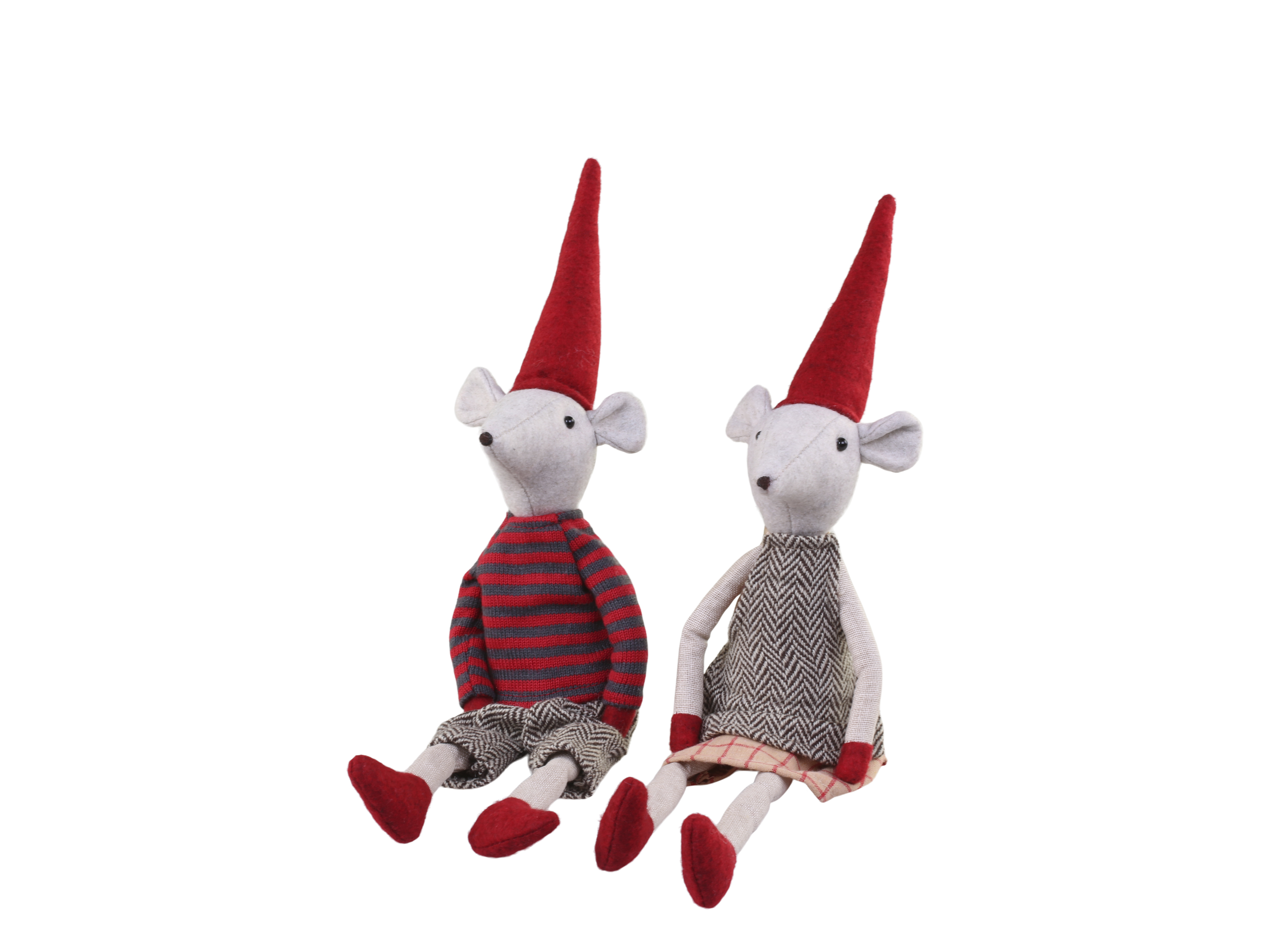 Chic Antiquen ihastuttava Noa -hiiri. Noan voit asettaa istumaan nojatuoliin tai sohvalle. Hiirellä on yllään raitapaita,housut ja punaiset tossut. Punaisessa tonttulakissa on rautalanka ja sitä voit käännellä haluamaasi suuntaan. Myös käsiä voi taivuttaa. Hiiren korkeus 38cm.