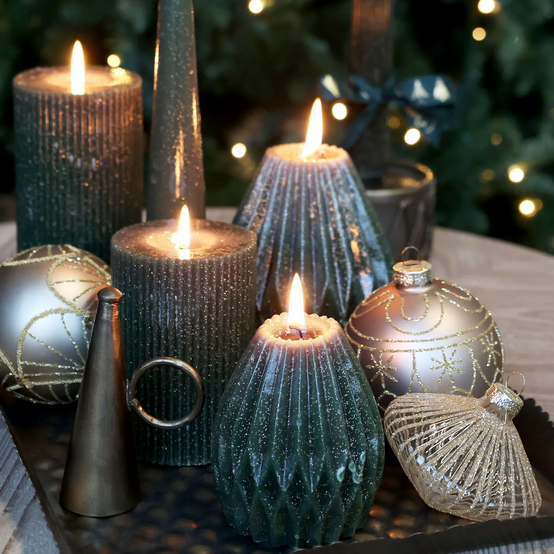 Tämä vihreä pöytäkynttilä huokuu luonnonläheistä tunnelmaa ja tuo kotiin ripauksen talvista juhlan tuntua. Kynttilän pinnassa on uritus ja kevyesti kullan kimallusta. Se lisää kynttilään juhlavaa ilmettä. Kynttilä sopii täydellisesti osaksi joulusisustusta tai luomaan lämpöä ja tunnelmaa pimeisiin iltoihin.