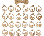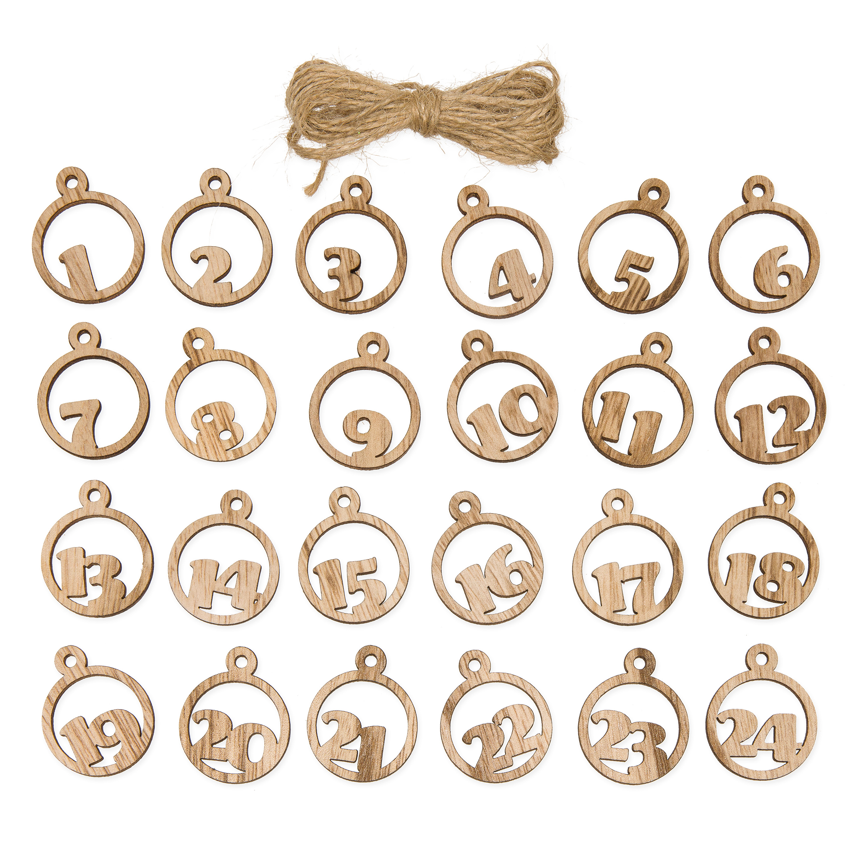 Täydennä itse tehty joulukalenteri näillä pyöreillä puisilla numeroilla. Näitä numeroita käytät itse tehdyssä joulukalenterissa vuodesta toiseen. Pakkauksessa numerot 1-24 sekä juuttinarua, jota voit käyttää numeroiden sitomiseen kalenteriin.