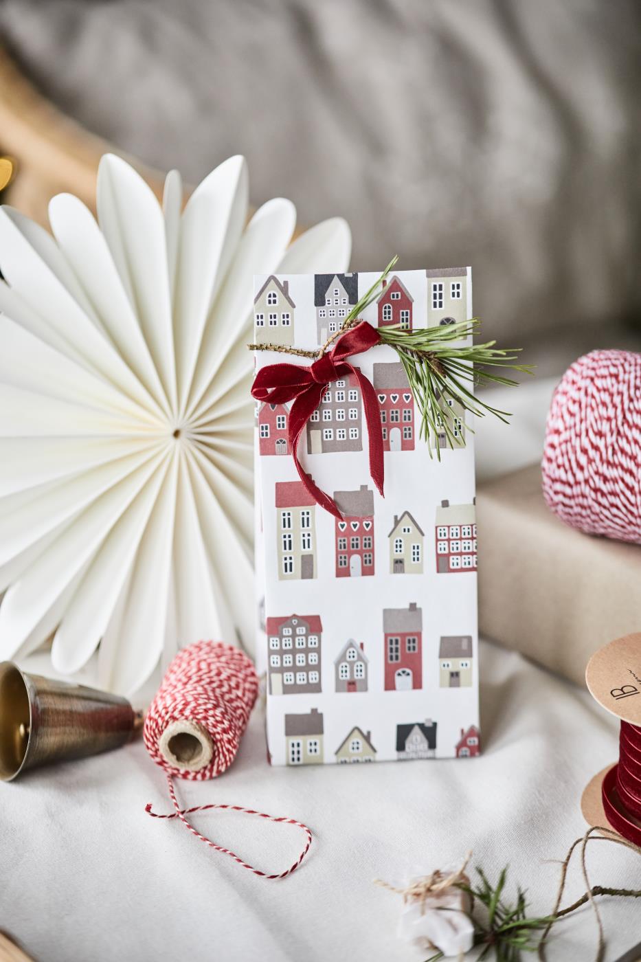 Ib Laursenin jouluiset lahjapussit ovat suosittuja vuodesta toiseen. Niihin kääräiset helposti pienet lahja ja muistamiset. Tämä lahjapussi jatkaa suosittua talo -aihetta. Valkoisella pohjalla on erilaisia ihastuttavia taloja. Samanlaisia taloa löydät myös lyhtyinä! Tästä kuosista on saatavilla kolmea eri kokoa. Pussin pohjan koko on 9 × 6 cm ja sen korkeus 22,5 cm.