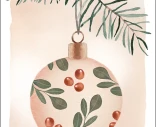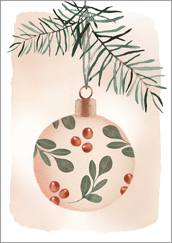 Kotimainen 2-osainen joulukortti laadukasta kartonkia. Kannessa kuva kuusen oksasta ja koristeellisesta joulupallosta. Kortti on sisältä tyhjä ja sisältää kirjekuoren. Henna Adelin herkät ja ainutlaatuiset kuvitukset ilahduttavat ja saavat joulumielen heräämään. Koko 105 x 148mm. Design Henna Adel.