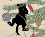 2-osainen joulukortti laadukasta kartonkia. Kannessa kuva mustasta kissasta tonttulakki päässä joka roikkuu kuusen oksasta. Koko 167 x 118 mm. Korteissa on käytetty tehosteena kohopainettuja ja folioituja yksityiskohtia. Kortti on tekstitön ja sisältää kullan värisen kirjekuoren. Design: Bug Art.