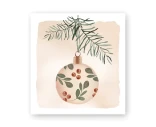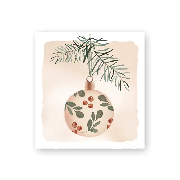 Joulupakettikortti, jonka kuvassa on joulukuusenkoristepallo. Tyhjä sisältä. Koko 72 x 77 mm. Kortin takaosassa reikä lahjanarulle. Design Henna Adel. Painettu Suomessa.