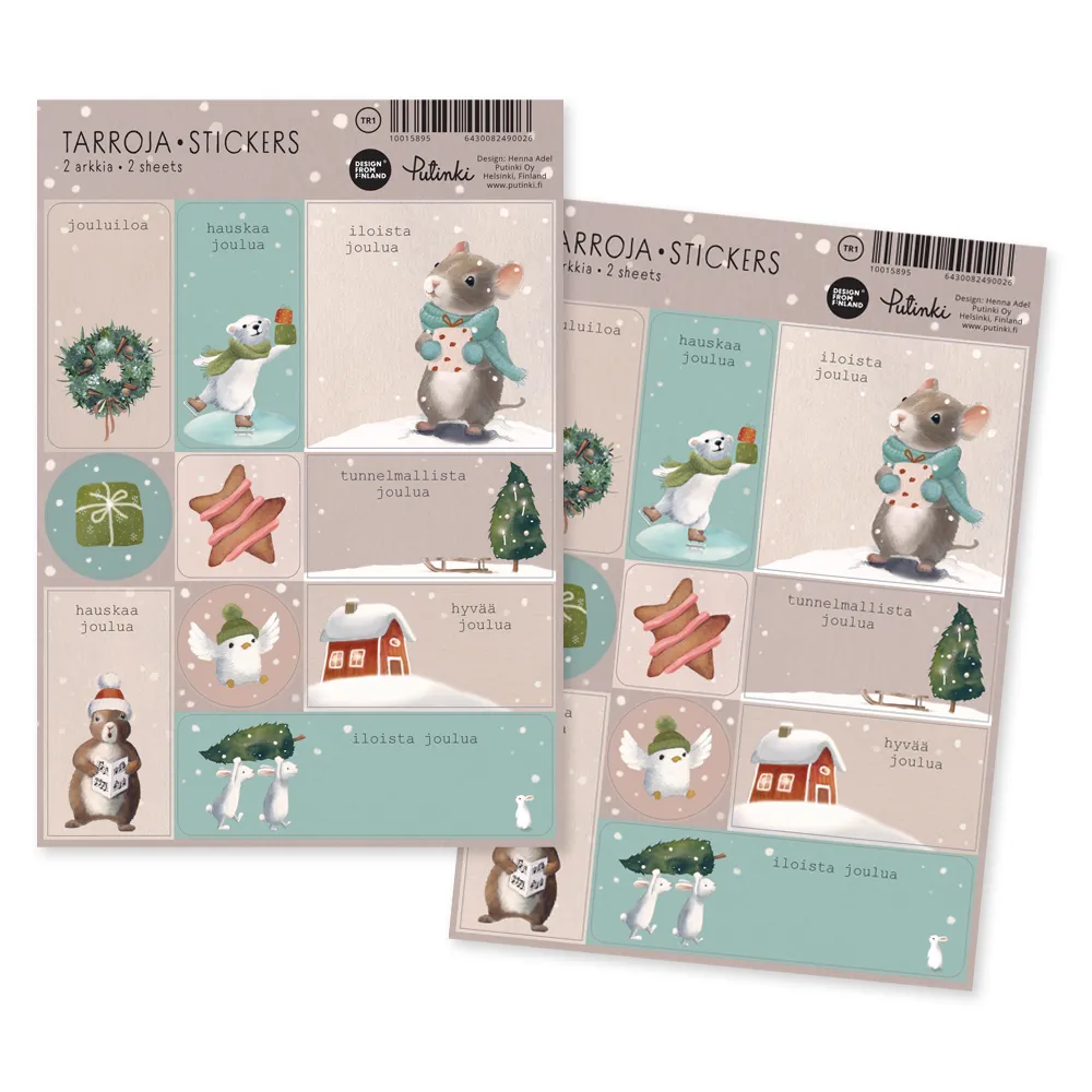 Pakkaus sisältää 2 samanlaista A5 kokoista arkkia joissa on erilaisia jouluisia pakettitarroja yhteensä 20 tarraa. Kuvissa joulupukuiset hiiri, orava ja jääkarhu, joulukuusi, kranssi, pipari ym. Taustan väreinä pehmeät vihreä ja beige. Käytä esimerkiksi lahjapaketteihin tai koristeluun. Painettu Suomessa. Design:Henna Adel.