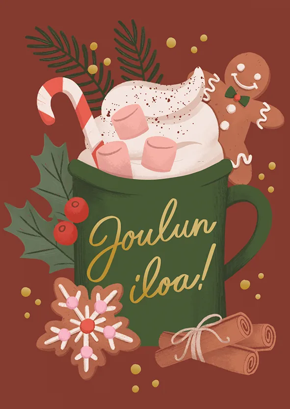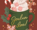 Kotimainen 1-osainen joulukortti laadukasta kartonkia. Kuvassa vihreä kaakaomuki täynnä kermavaahtoa ja karkkeja, jossa teksti "Joulun iloa!". Kortissa on kultafolioidut yksityiskohdat ja se on tekstitön kääntöpuolelta. Koko 105 x 148 mm. Design: Kaisu Sandberg.