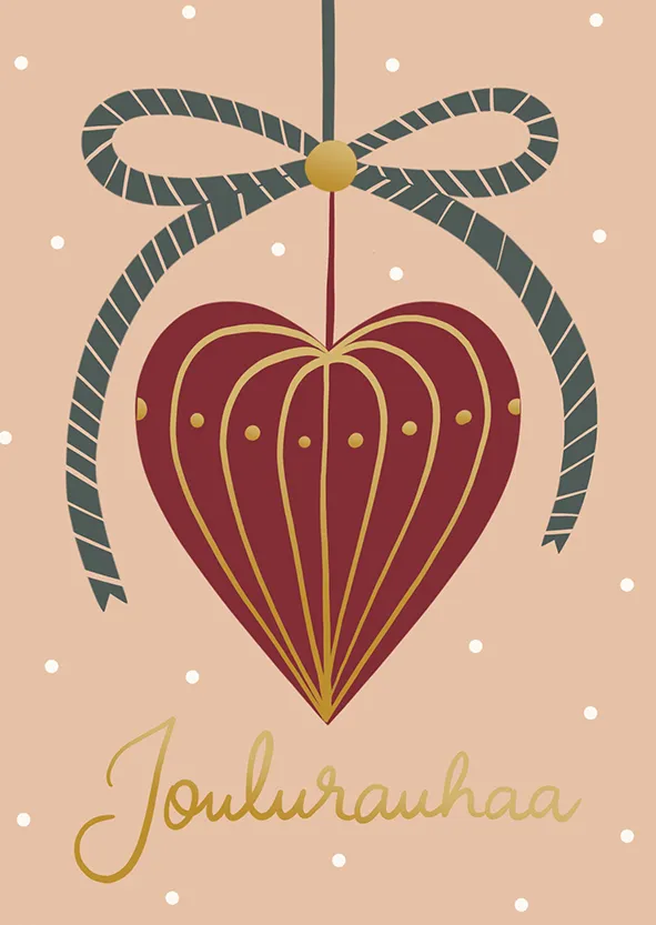 Kotimainen 1-osainen joulukortti laadukasta kartonkia. Kuvassa sydämen muotoinen joulukuusenkoriste, vaaleanpunainen tausta sekä teksti "Joulurauhaa". Kortissa on kultafolioidut yksityiskohdat ja se on tyhjä kääntöpuolelta. Koko 105 x 148 mm. Design: Putinki Letters.