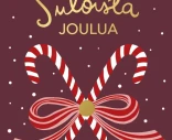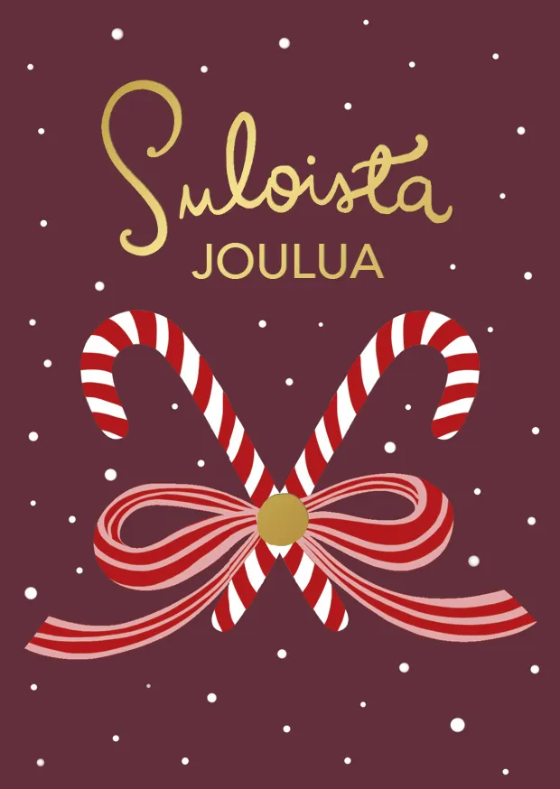 Kotimainen 1-osainen joulukortti laadukasta kartonkia. Kuvassa punavalkoraidalliset karkkikepit sidottu rusetilla, ylhäällä teksti "Suloista joulua". Kultafolioidut yksityiskohdat. Viininpunainen/ruskea pilkullinen tausta. Koko 105 x 148mm. Design: Putinki Letters.