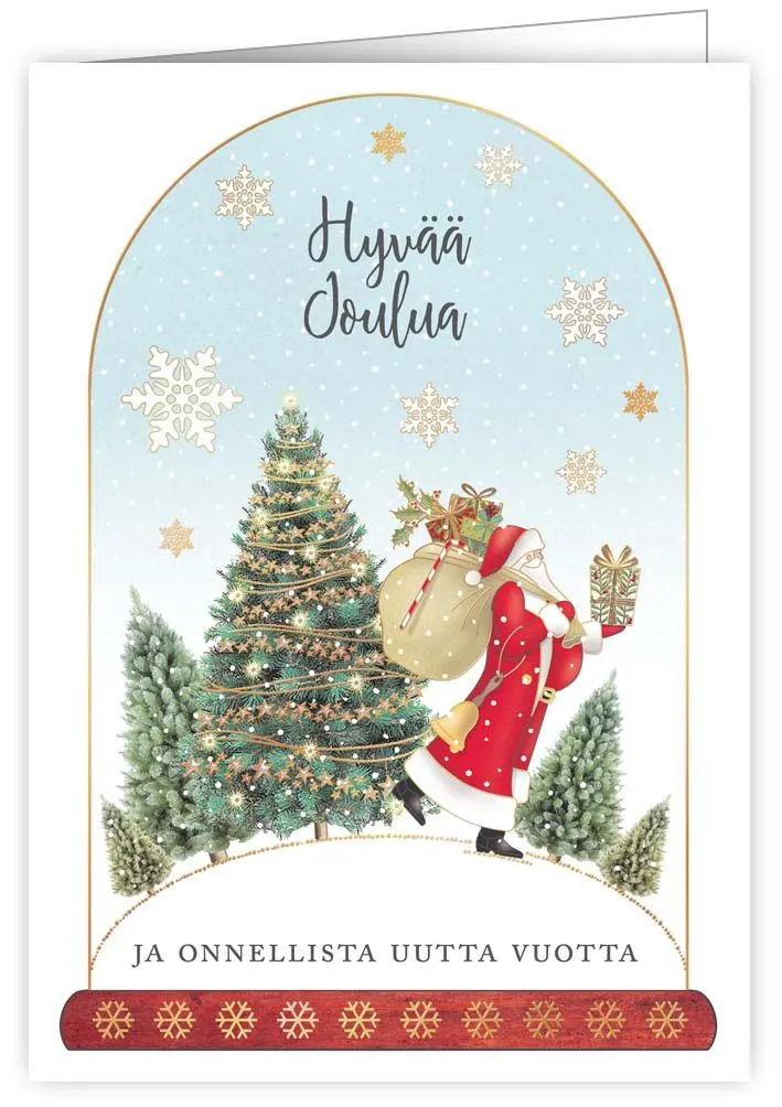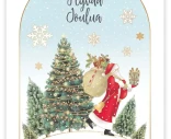 2-osainen joulukortti laadukasta kartonkia. Kortin kannessa teksti "Lämpimät jouluntoivotukset ja hyvää uutta vuotta", sekä joulupukki, joulukuusi ja lahjasäkki. Kortissa on hopeafolioidut yksityiskohdat, se on sisältä tekstitön ja sisältää kirjekuoren. Koko 163 x 115 mm. Design: Quire. Painettu Hollannissa.