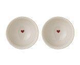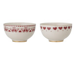 Bloomingvillen kaunis Jolly -sarjan kulho. Sarjaan kuuluu kaksi erilaista pohjaväriltään luonnonvalkoista kulhoa. Tässä kulhossa on punaiset sydämet koristeena. Kulhon pohjassa on kullanvärinen yksityiskohta.