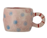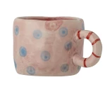 Bloomingville Nini on hurmaava pieni muki, joka on kuin pieni taideteos. Pehmeän vaaleanpunaisella pinnalla siniset pilkut ja mukin pyöreä, raidallinen korva tuo hauskaa sekä persoonallista ilmettä. Muki on käsintehty ja -maalattu, joten jokainen kappale on ainutlaatuinen. Pienen kokonsa ansiosta Nini sopii täydellisesti espressolle, mutta toimii mainiosti myös vaikkapa pienelle jäätelöpallolle tai koristekäytössä.