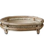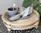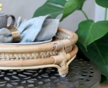 Upea Chic Antiquen tarjotin on valmistettua vaaleanruskeasta rottingista. Tarjottimessa on matalat jalat, joissa on muovinasta suojamassa jalkoja. Tarjottimessa on kaunis punos.