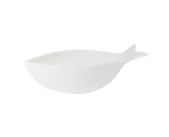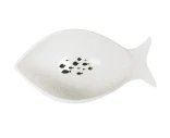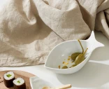 Tämä suloinen pieni kulho on muotoiltu kalan siluetiksi ja henkii merellistä tunnelmaa hillityllä ja tyylikkäällä tavalla. Valkoisen posliinin pinnassa on kauniita kohokuvioita, jotka muistuttavat vedenalaista kasvillisuutta. Kulhon pohjalla uiskentelee pieni parvi kultaisia ja mustia kaloja. Kulho sopii täydellisesti pikkusyötävien, kuten oliivien, pähkinöiden tai kastikkeiden tarjoiluun. Se toimii myös kauniina koriste-esineenä osana kattausta tai vaikka kylpyhuoneessa koruille ja muille pienille esineille.