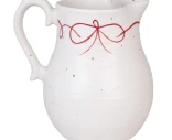 Tuo kattaukseesi ripaus perinteistä viehätystä ja käsityön lämpöä tällä kauniilla keraamisella kannulla. Punainen, käsinmaalattu rusettikoriste kiertää kannun yläreunaa, luoden yksityiskohtaisen ja uniikin ilmeen, joka sopii täydellisesti niin juhlapöytään kuin arkisiin hetkiin. Tämä kannu on täydellinen valinta veden, mehun tai vaikka talvisten glögien tarjoiluun. Sen pehmeä valkoinen sävy ja pilkullinen viimeistely tekevät siitä monikäyttöisen osan sekä modernia että rustiikkista sisustusta. Täydellinen lahja tai tyylikäs lisä omaan keittiöön!