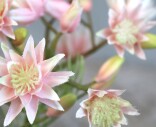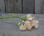 Chic Antiquen koristekukka herkillä värisävyillä. Yhdessä kukkaoksassa on yhdeksän avoinna olevaa kukkaa ja 15 nuppua. Kukat ovat ja herkät vaaleanvihreät lehdet muovia. Materiaalina siis rauta, PE, PVC ja polyfiber. Oksan pituus on 51cm.