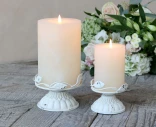 Chic Antique kynttilänjalka on kaunis ja romanttinen sisustuselementti. Valkoiseksi maalattu metallinen jalka on koristeltu lehtikuviolla ja patinoidulla viimeistelyllä, joka tuo esineeseen rustiikkista viehätystä. Sopii enintään 7 cm halkaisijan kynttilöille. Ihanteellinen valinta pöydälle, ikkunalaudalle tai osaksi tunnelmallista kattausta.