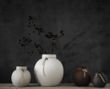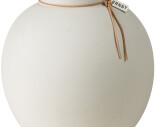 Valkoinen pyöreä maljakko kivitavaraa. Upeasti vimeistelty mattavalkoinen pinta. Pyöreän kaulan ympärillä on ohut nahkanauha, johon kiinnitetty metallinen merkki "ERNST".