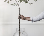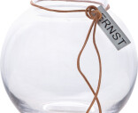 ERNSTIN kaunis pieni pyöreä lasimaljakko. Maljakon suulla koristeena solmittu nahkanauha, johon kiinnitetty metallinen merkki "ERNST".