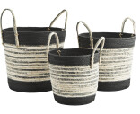 Madam Stoltzin maissinlehdistä punottu pyöreä ja tukeva kori. Osa maissinlehdistä ovat mustia, jolloin koriin muodostuu kauniita raitoja. Kahvojen ansiosta koria on helppo siirtää paikasta toiseen. Korit sopivat kodissasi kaikkiin tiloihin eteisestä kylpyhuoneeseen. Sarjaan kuuluu kolme erikokoista koria, joista tässä on keskikoko.