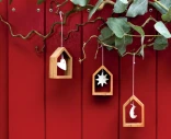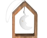 Räderin kaunis koriste. Valkoisesta posliinista tehty kuu on laitettu narulla roikkumaan puiseen kehykseen. Sopii koristeeksi vaikkapa ikkunalle tai hyllylle. Kiva lahja uuteen kotiin!