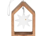 Räderin kaunis koriste. Valkoisesta posliinista tehty tähti on laitettu narulla roikkumaan puiseen kehykseen. Tähdessä yksityiskohtana pienen pieni kultainen tähti. Sopii koristeeksi vaikkapa ikkunalle tai hyllylle. Kiva lahja uuteen kotiin!