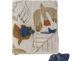 Boheemi ja lämmin Bloomingvillen kuviollinen torkkupeitto, jossa maanläheiset lintukuviot ja siniset tupsut tuovat kodikkuutta sisustukseen.