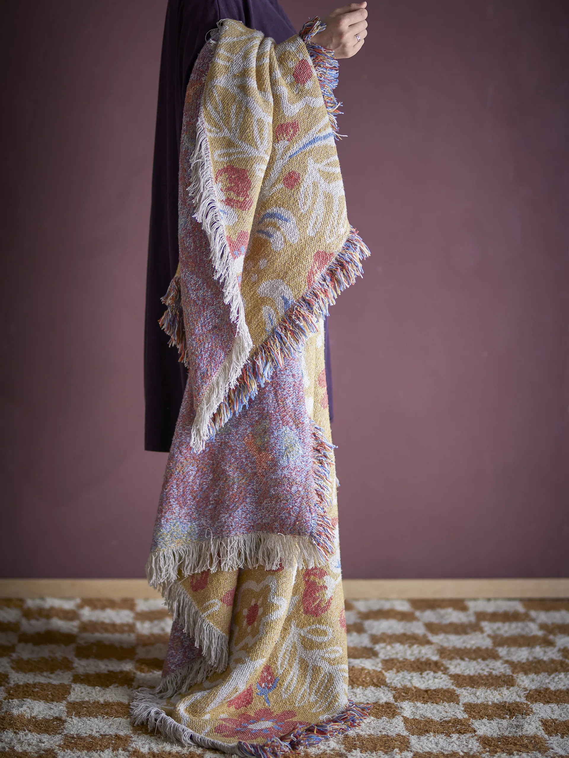 Bloomingville Reims -peitto hurmaa lämpimillä väreillään ja boheemilla kukkakuosillaan. Pehmeä peitto tuo sisustukseen kodikkuutta ja persoonallisuutta. Sen keltapohjainen kuviointi raikastaa tilan hetkessä. Täydellinen sohvan päälle, sängyn jalkopäähän tai vaikka viileiden iltojen lämmittäjäksi.