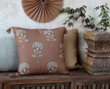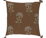 Chic Antiquen tyynynpäällisessä on kaunis kukkakuviointi. VÄrinä on lämmin oranssiin vivahtava ruskea. Kulmissa on tupsut. Takana vetoketju sisätyynyä varten. Voit yhdistää tyynynpäällisen helposti yksiväristen tekstiilien kanssa.