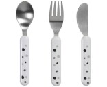 Suloiset ja käytännölliset Done by Deerin aterimet. Varren pinnasta saa tukevan otteen, jolloin omatoimisen ruokailun harjoittelua on helppoa. Pakkauksessa haarukka, veitsi ja lusikka.