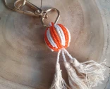 Raikkaan oranssi-valkoinen avaimenperä tuo pirteää kontrastia ja pehmeää charmia tupsujen muodossa. Jokainen kappale on valmistettu käsin Nai Disha -projektissa, jossa naiset luovat tuotteita omilla taidoillaan ja tukevat samalla toistensa mahdollisuuksia parempaan elämään.