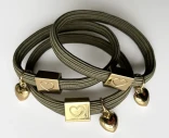 Noordlivingin oliivinvihreä rannekoru on tyylikäs valinta, joka sopii moneen asuun. Kullanvärinen sydänriipus ja metallinen yksityiskohta tuovat kontrastia ja hienostuneisuutta luonnonläheiseen sävyyn. Kätevä asuste, joka toimii yhtä hyvin hiuslenkkinä kuin rannekoruna.