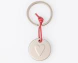 Räderin ihastuttava avaimenperä. Pyöreään metalliosaan on kohokuvioitu sydän. Se on renkaassa kiinni punaisella nahkanarulla.