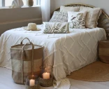 Tuo makuuhuoneeseen rauhallinen ja kutsuva tunnelma tällä Chic Antiquen kauniilla päiväpeitolla. Peitto on valmistettu osittain kierrätysmateriaalista ja huokuu luonnonläheistä tyyliä, joka sopii täydellisesti skandinaavisen sisustuksen sävyihin. Päiväpeiton muhkean pehmeä kangas ja näyttävä kuviointi tuovat ylellistä tekstuuria vuoteeseen. Hillityn vaalea sävy on helppo yhdistää erilaisiin petivaatteisiin ja sisustustyyleihin.