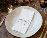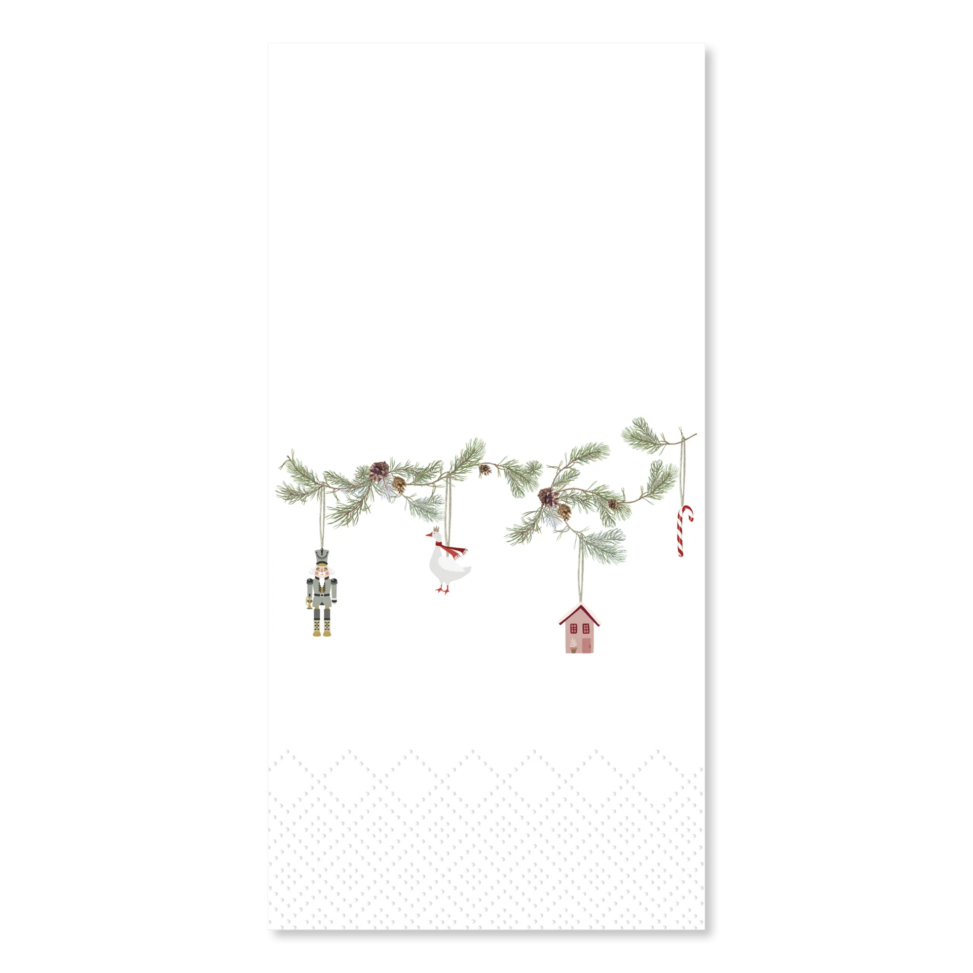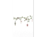 Chic Antique -paperiservetti hurmaa suloisella ja perinteisellä joulutunnelmallaan. Valkoisella taustalla kulkee havunoksa, johon on ripustettu viehättäviä joulukoristeita: pieni talo, sokerikeppi, hanhi ja pähkinänsärkijä. Yksityiskohtainen kuvitus tuo mieleen klassiset joulukortit ja tekee kattauksesta lämpimän ja kodikkaan. Taitettuna servetti on kooltaan 10 x 20 cm ja avattuna 40 x 40 cm. Pakkauksessa servettejä 16 kappaletta.