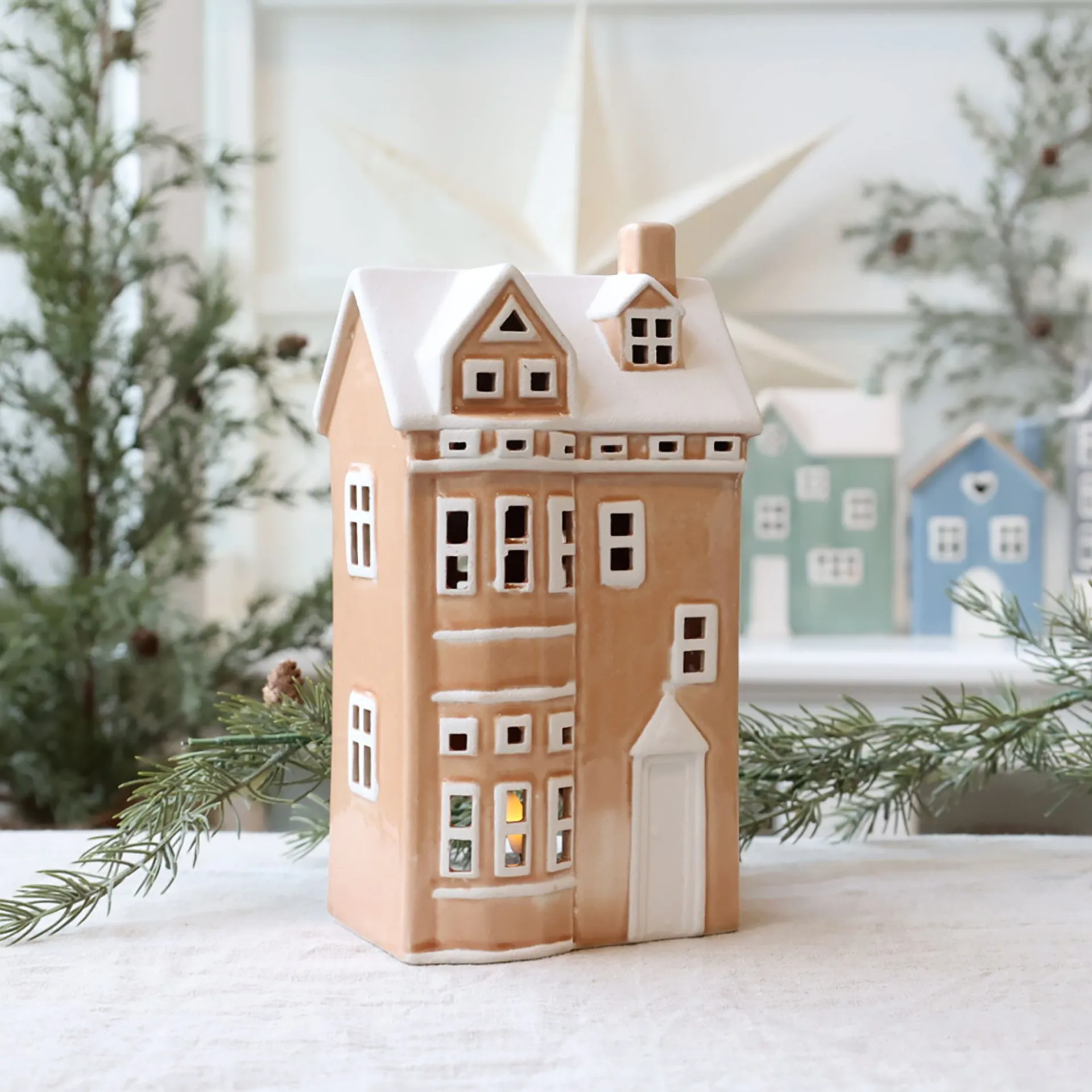 Chic Antique -ruskea talolyhty luo ihastuttavaa joulun tunnelmaa kodin sisustukseen. Kauniin karamellinruskea sävy ja lumipeitteinen katto tuovat mieleen vanhan ajan joulukylän. Lyhty on valmistettu keramiikasta, ja sen valkoiset yksityiskohdat ovat puuterimaiset. Talon ikkunoista hohtava valo luo lämpimän ja rauhallisen fiiliksen. Sopii erinomaisesti osaksi talolyhtykylää tai yksittäiseksi koristeeksi pöydälle tai ikkunalaudalle.