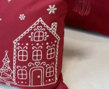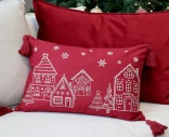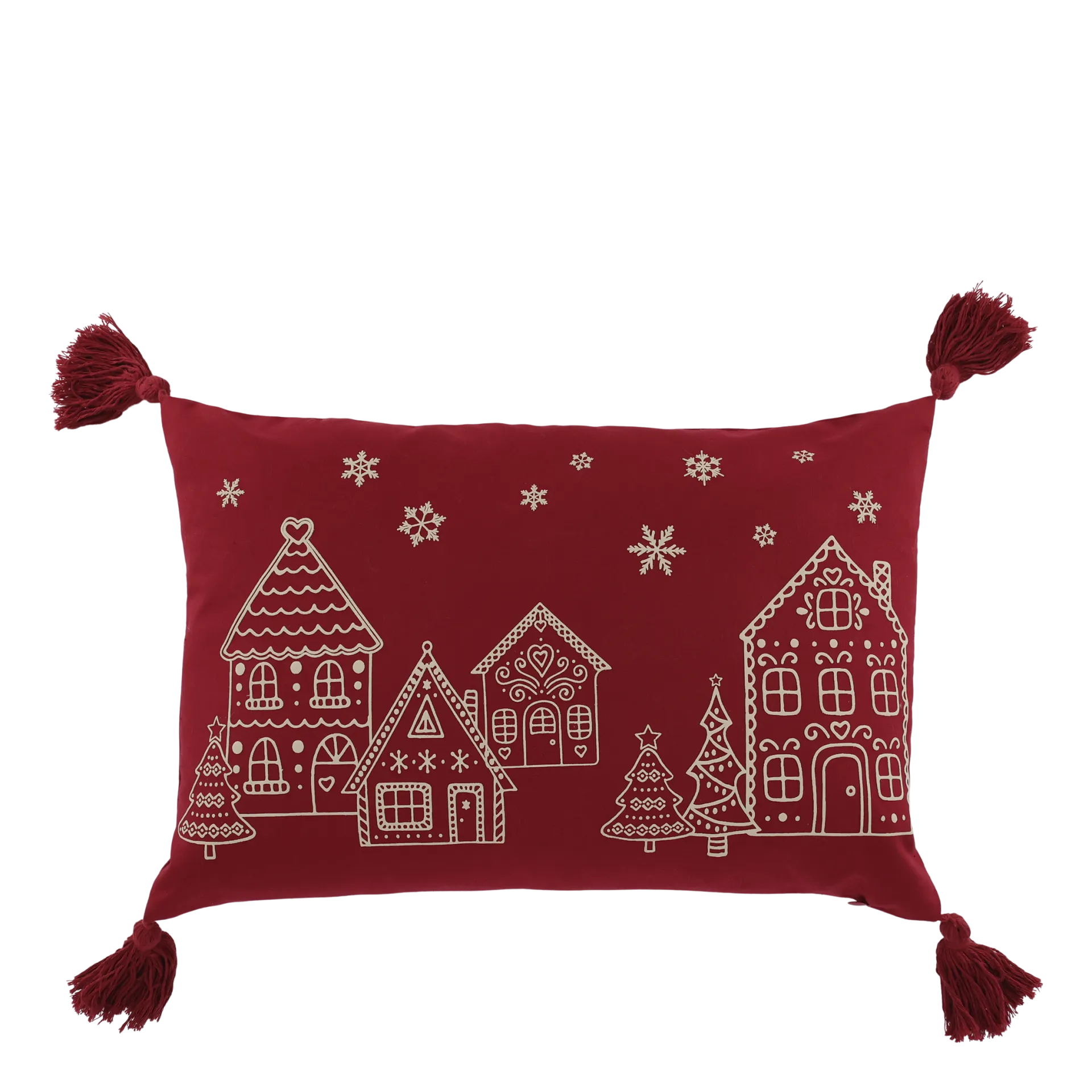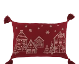 Chic Antique -tyynynpäällinen tuo kotiin ripauksen jouluista lämpöä ja kodikkuutta. Syvänpunaisella kankaalla on suloisia piparkakkutaloja ja lumihiutaleita luonnonvalkoisella kuvioinnilla.Kuin pieni kylä talvisessa maisemassa. Kulmien tupsut viimeistelevät tyynynpäällisen hurmaavan ilmeen. Sopii täydellisesti sohvalle, nojatuoliin tai sängylle tuomaan juhlan tunnelmaa.