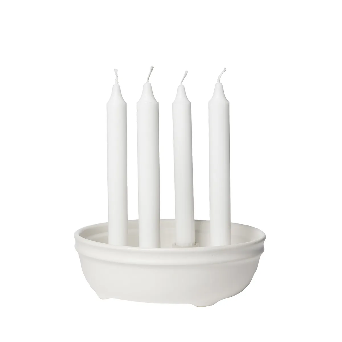 Ernstin kynttiläkulho on ajaton ja monikäyttöinen sisustuselementti, joka tuo kotiin lämpöä ja rauhallista tunnelmaa. Kulhoon mahtuu neljä kruunukynttilää. Kynttilöiden ympärille voi helposti sommitella sammalta, käpyjä tai muita kauden koristeita. Valkoinen, pelkistetty design sopii kauniisti skandinaaviseen sisustukseen ja tekee siitä täydellisen adventtikynttilöille.
