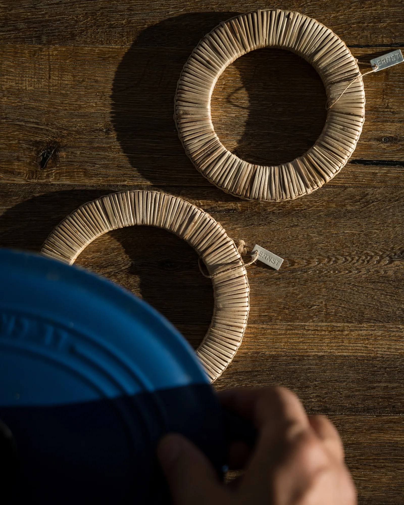 Ernstin kaunis luonnonmateriaaleista valmistettu pannunalunen on sekä käytännöllinen että tyylikäs lisä kattaukseen. Pyöreä, punottu muoto tuo lämpöä ja luonnollista tunnelmaa ruokapöytään. Erinomainen suoja kuumille kattiloille ja uunivuoille. Kaunis myös sellaisenaan osana keittiön sisustusta. Metallinen Ernst-logo viimeistelee ajattoman ilmeen.