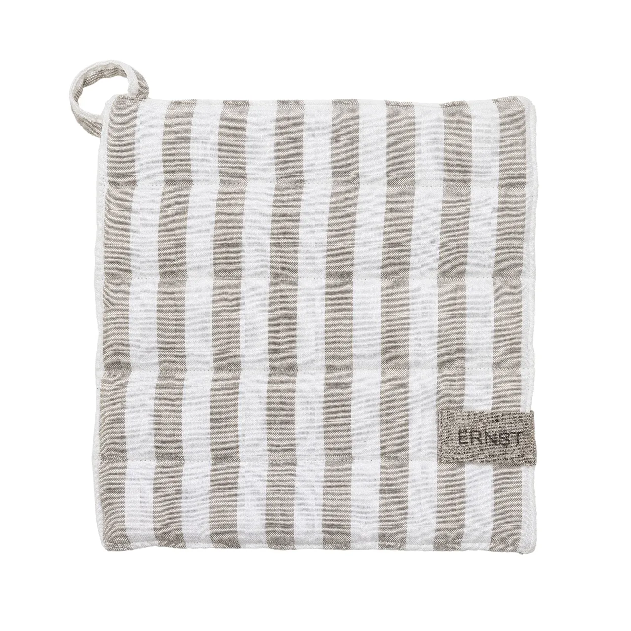 Ernstin raidallinen patalappu yhdistää kauniin designin ja käytännöllisyyden. Pehmeästi topattu puuvillapatalappu suojaa käsiä kuumuudelta ja tuo keittiöön luonnollista, skandinaavista tyyliä. Beige-valkoinen raitakuosi on ajaton ja sopii helposti yhteen muiden keittiötekstiilien kanssa. Tyylikäs ripustuslenkki tekee patalapusta myös kauniin yksityiskohdan esille jätettynä.