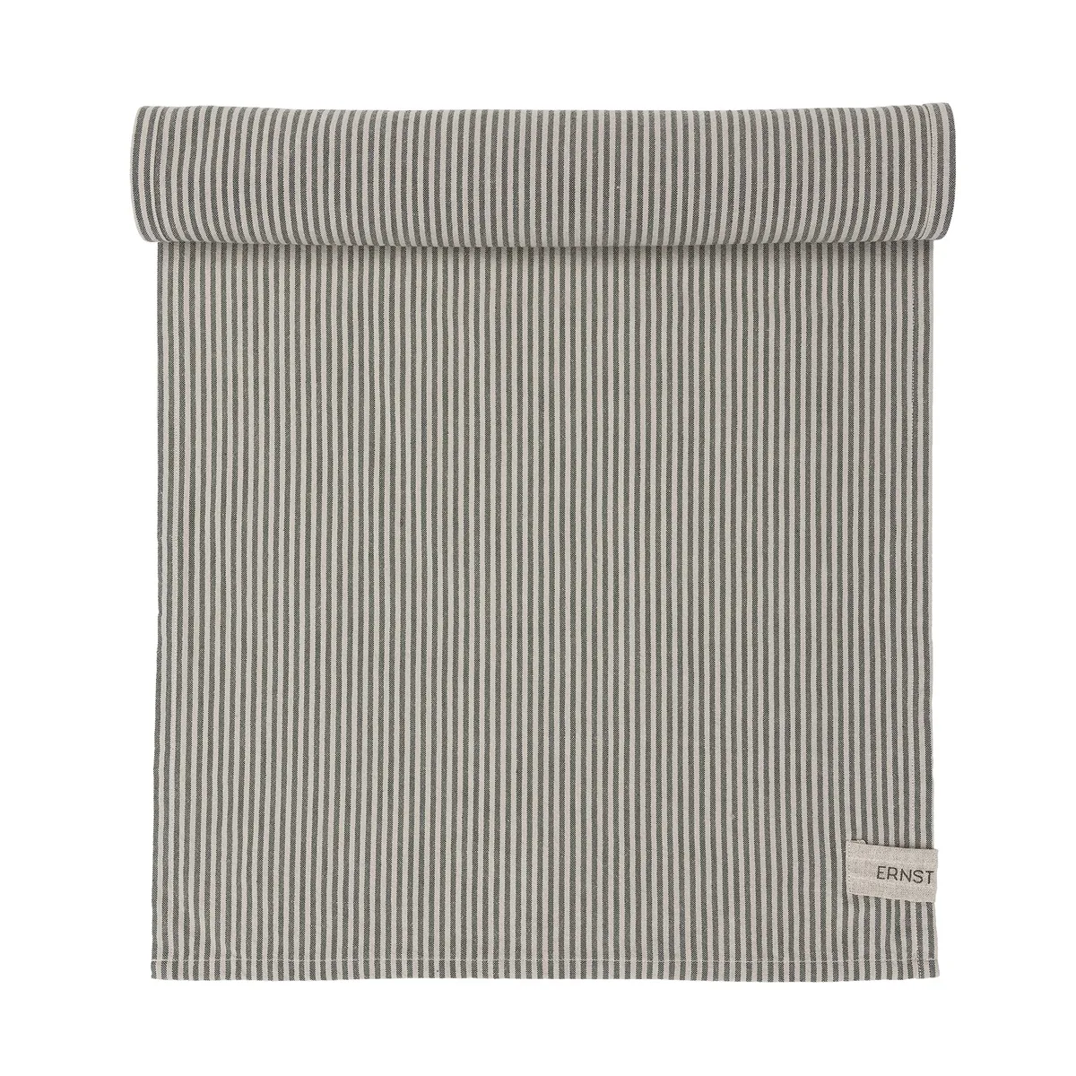 Ernstin vihreä-beige raidallinen kaitaliina tuo kattaukseen harmonista ja luonnonläheistä tunnelmaa. Pehmeä puuvillakangas laskeutuu kauniisti ja tekee arjen aterioista sekä juhlapöydistä viimeistellyn näköisiä. Hillitty raitakuosi sopii monenlaiseen sisustustyyliin ja yhdistyy kauniisti neutraaleihin sävyihin. Erinomainen valinta moderniin ja lämminhenkiseen kotiin.