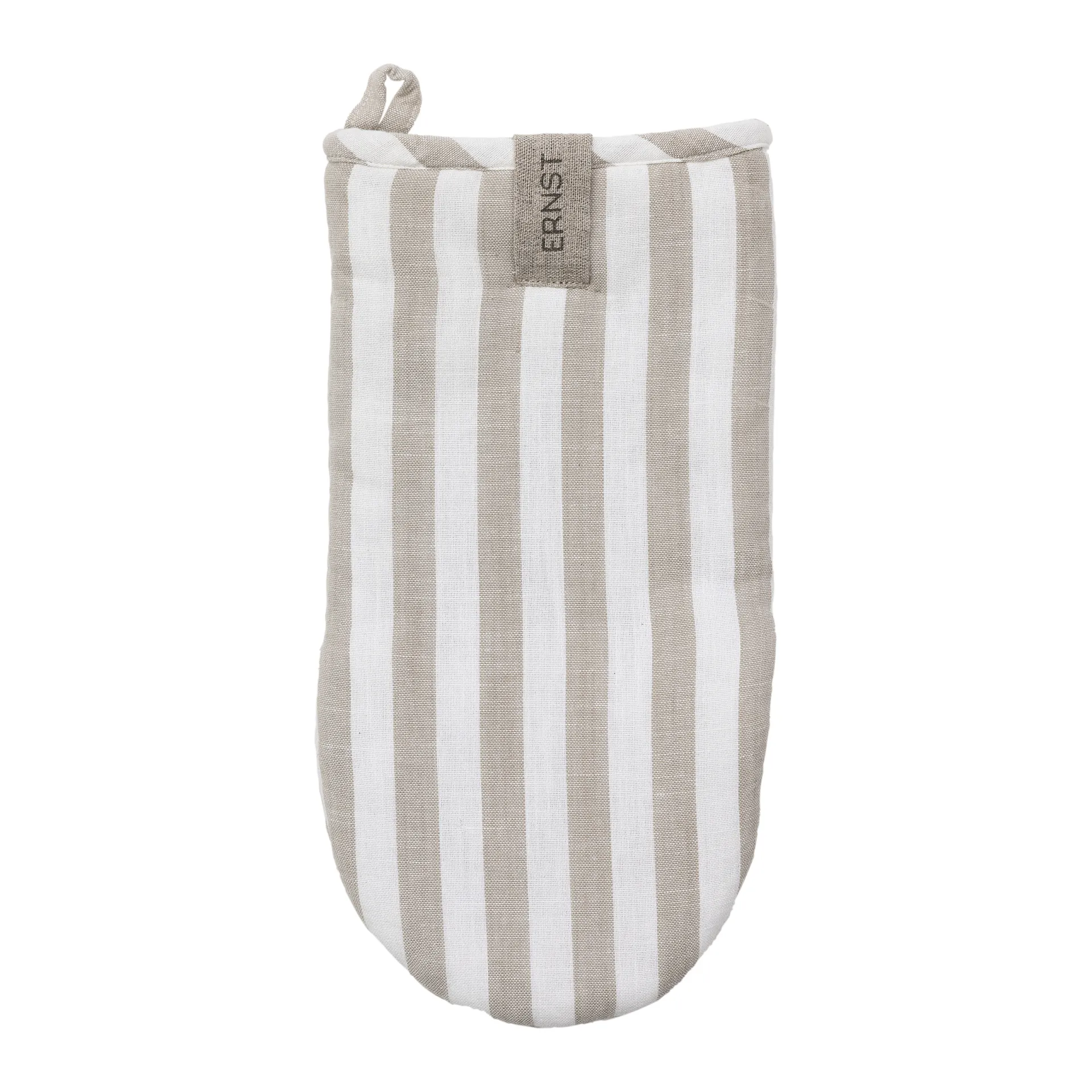 Ernstin raidallinen patakinnas on tyylikäs ja käytännöllinen apuri keittiössä. Beige-valkoinen raitakuosi tuo raikasta ja klassista ilmettä, joka sopii monenlaiseen sisustustyyliin. Pehmeä ja hyvin topattu puuvillakangas suojaa tehokkaasti kuumuudelta, ja ripustuslenkki tekee säilytyksestä helppoa. Kaunis ja toimiva valinta ruoanlaittoon sekä lahjaksi designia arvostavalle.