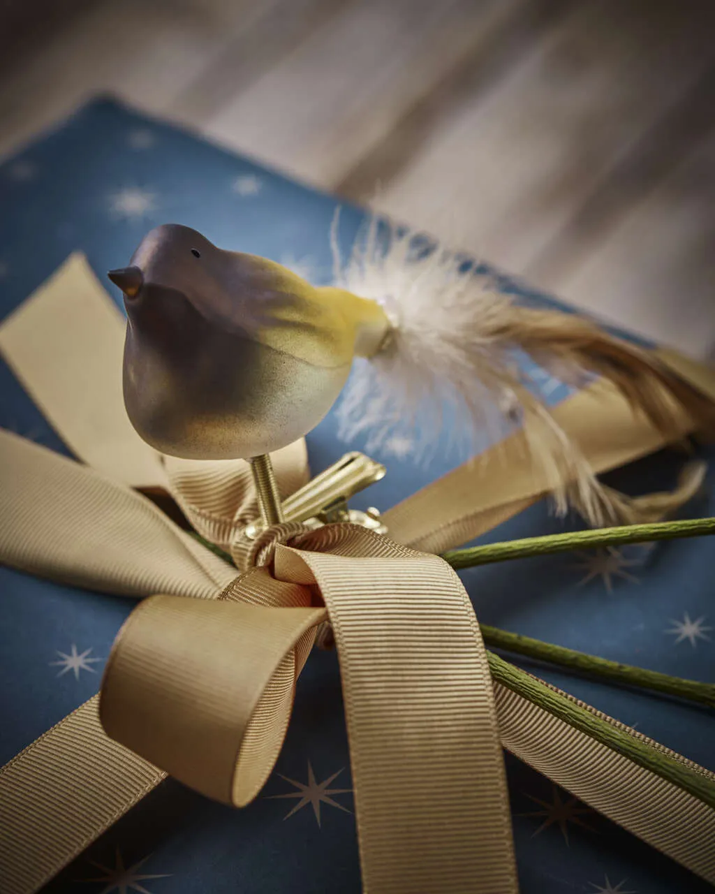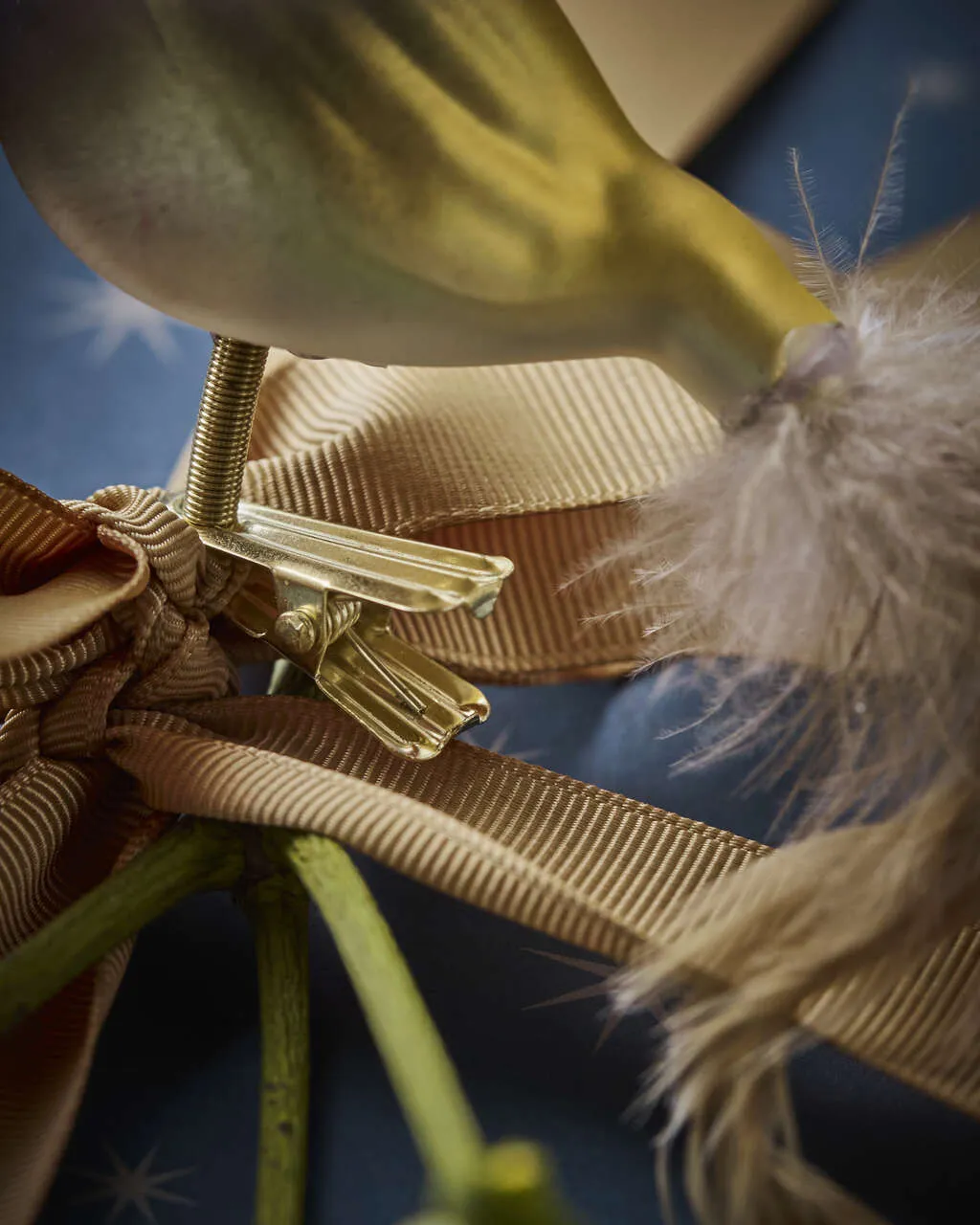 House Doctor Safar -koristelintu tuo luonnonläheistä eleganssia ja vintage-henkistä tunnelmaa joulukuuseen tai juhlakattaukseen. Koriste on valmistettu kauniisti sävytetystä lasista, jossa sulautuvat lämpimät ruskean, kullan ja hunajankeltaisen sävyt. Lintua koristaa pehmeä höyhenhäntä, joka lisää keveyttä ja eloa koristeeseen. Klipsikiinnitys tekee sen asettamisesta helppoa. Kiinnitä koriste kuusen oksalle, kranssin tai vaikka lahjapaketin koristeeksi.