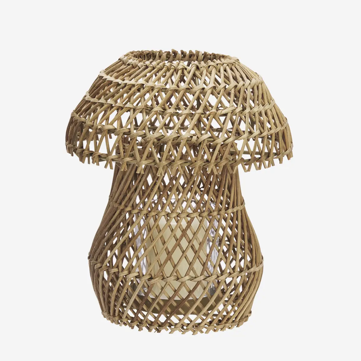 Madam Stoltzin sienen muotoinen rottinkilyhty on hurmaava ja luonnonmateriaalinen sisustuselementti, joka luo pehmeää ja lämmintä valoa kotiin. Vietnamissa käsin punottu rottinki antaa lyhdylle kauniin, ilmavan rakenteen, ja sen sisällä oleva lasinen kynttiläpidike tekee siitä turvallisen käyttää. Lyhty sopii erinomaisesti ikkunalaudalle, hyllylle tai pöydälle tuomaan syksyistä ja talvista tunnelmaa.