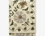 Madam Stoltzin Suzani-brodeerattu puuvillapeitto on upea ja yksityiskohtainen tekstiili, joka tuo sisustukseen lämpöä ja käsityön tuntua. Peitto on valmistettu pehmeästä puuvillasta (aika ohut puuvillakangas) ja koristeltu kauniilla kukka- ja lehtikirjailuilla vihreän, beigen ja harmaan sävyissä. Se sopii täydellisesti sohvall tai sängynpäätyyn, Jokainen peitto on uniikki ja edustaa perinteistä käsityötaidetta modernilla sävyllä.