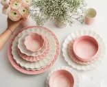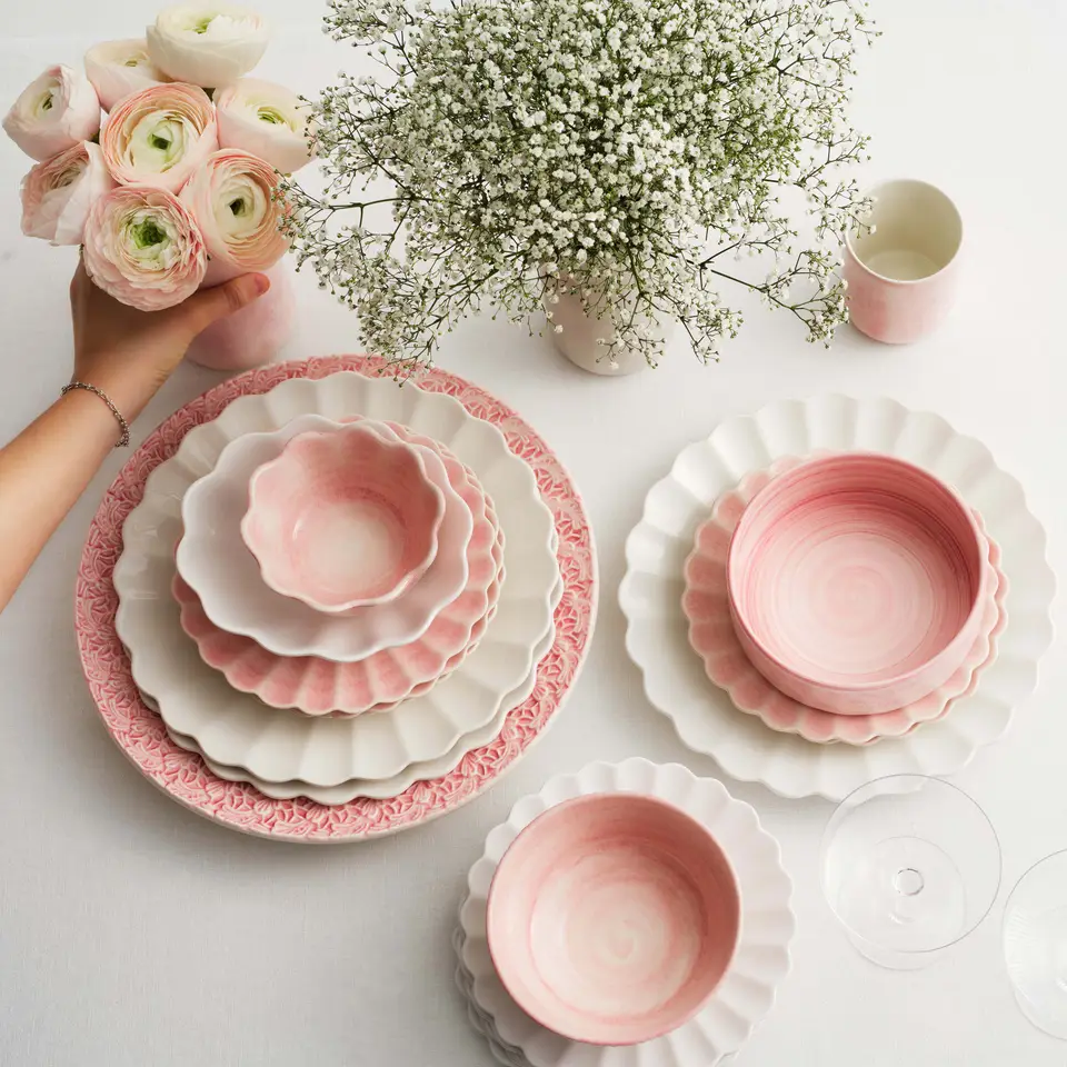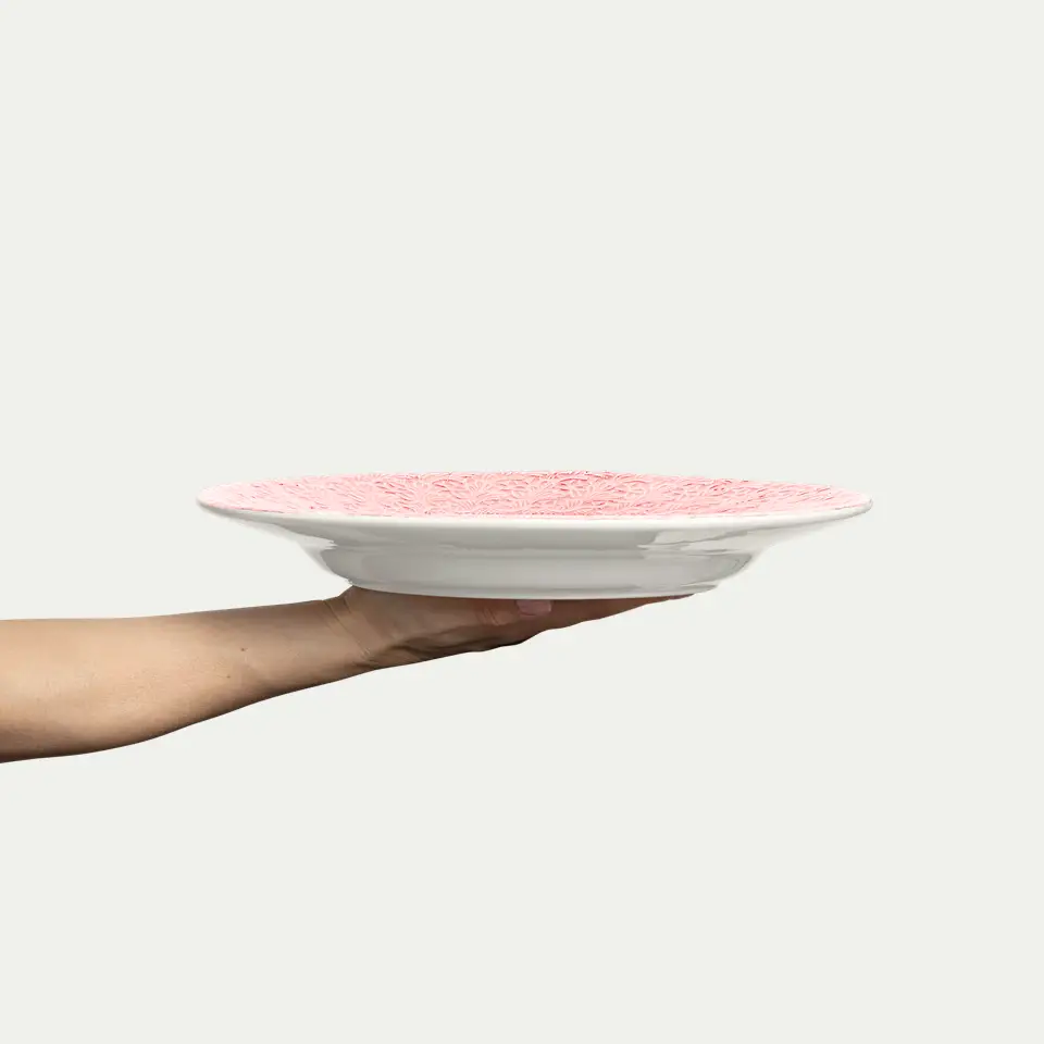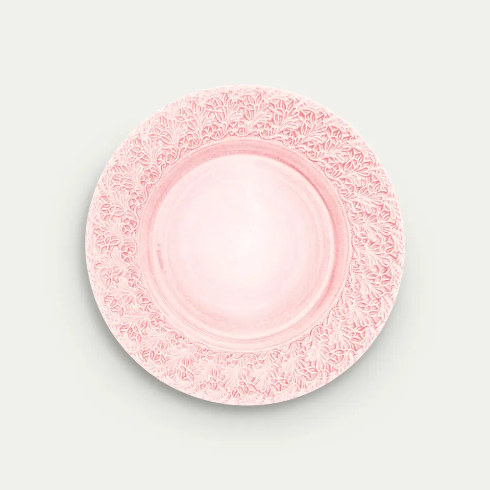 Mateus Lace -lautanen sävyssä light pink on näyttävä ja romanttinen katseenvangitsija. Sen kaunis pitsimäinen reunus ja käsintehty lasitus tuovat kattaukseen pehmeää eleganssia ja käsityön lämpöä. 32 cm:n halkaisija tekee lautasesta täydellisen tarjoiluastiana tai osana runsasta kattausta juhlahetkiin.