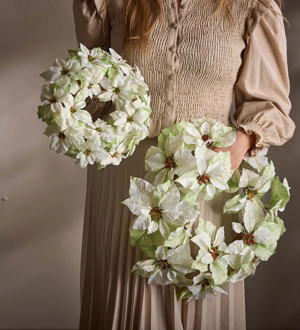 Näyttävä ja tunnelmallinen Mr Plant -joulutähti kranssi, jonka halkaisija on 50 cm. Valkoiset joulutähdet ja hennon vihreät lehdet tekevät kranssista elegantin koristeen joulukotiin. Suuri koko tekee kranssista upean katseenvangitsijan oveen, seinälle tai pöydän keskipisteeksi. Aidon näköinen ja kestävä koriste säilyy kauniina vuodesta toiseen.
