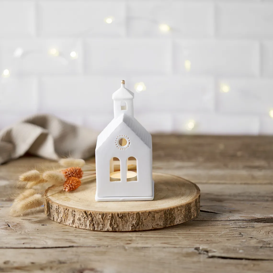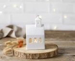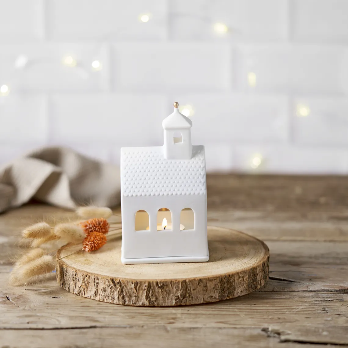 Räderin valkoinen kirkkolyhty on herkkä ja kaunis posliinilyhty, joka luo ympärilleen rauhallisen ja juhlavan tunnelman. Kultainen yksityiskohta kirkontornin huipulla tuo ripauksen lämpöä ja juhlan tuntua. Lyhty on täydellinen osa talolyhtykylää tai kaunis yksinään ikkunalaudalla, hyllyllä tai pöydällä. Valon hehku korostaa sen yksityiskohtia ja luo kodikkaan, levollisen tunnelman.