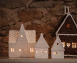 Räderin valkoinen talolyhty on kuin pieni posliininen piparkakkutalo, joka levittää ympärilleen lempeää valoa ja joulun tunnelmaa. Kauniit yksityiskohdat, sydänikkuna ja rei’itetyt pinnat päästävät valon siivilöitymään pehmeästi, luoden kodikkaan ja rauhallisen ilmeen. Tämä lyhty sopii täydellisesti osaksi talolyhtykylää tai yksinään lämpöiseksi valopisteeksi hyllylle tai pöydälle.