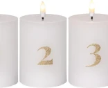 Tyylikkäät Star Trading -LED-adventtikynttilät luovat joulunajan tunnelmaa turvallisesti ja helposti. Neljän valkoisen kynttilän sarja on numeroitu kullan kimaltavilla numeroilla1–4 Kynttilät palavat aidon näköisellä liekillä. Kynttilöiden keskiosa näyttää sulaneelta, se tuo lisää aitouden tuntua kynttilään. Kaukosäätimen avulla kynttilät on helppo sytyttää joko yksitellen tai kaikki samanaikaisesti. Kynttilöissä on myös ajastintoiminto, jonka avulla ne voi asettaa palamaan kuuden tunnin ajaksi. Kaunis ja huoleton vaihtoehto perinteisille adventtikynttilöille. Kukin kynttilä toimii kahdella AA-paristolla, jotka eivät sisälly pakkaukseen. Kaukosäädin vaatii CR2032-pariston, joka ei myöskään sisälly pakkaukseen.